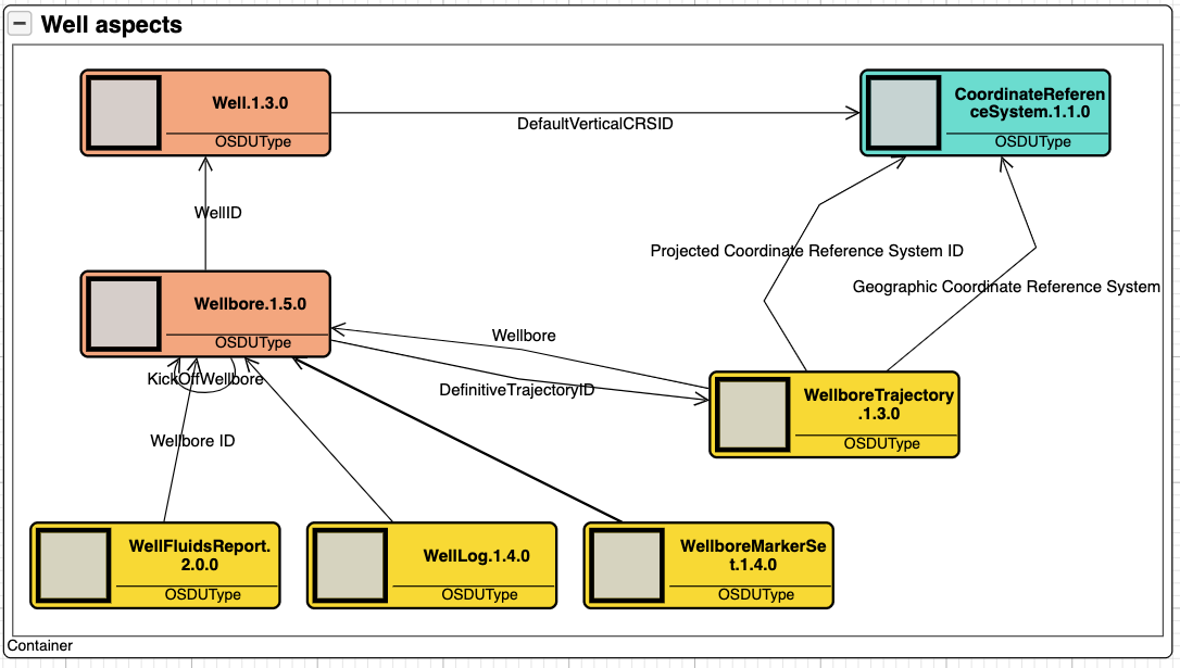 Figure 1 tells the reader that the wells domain has two concepts; well and wellbore. That all wells are geolocated and that the wellbore is the aggregator of associated datasets such fluid reports, logs, markers and trajectories. Lastly that trajectories come with some additional features that we leave as is for now.