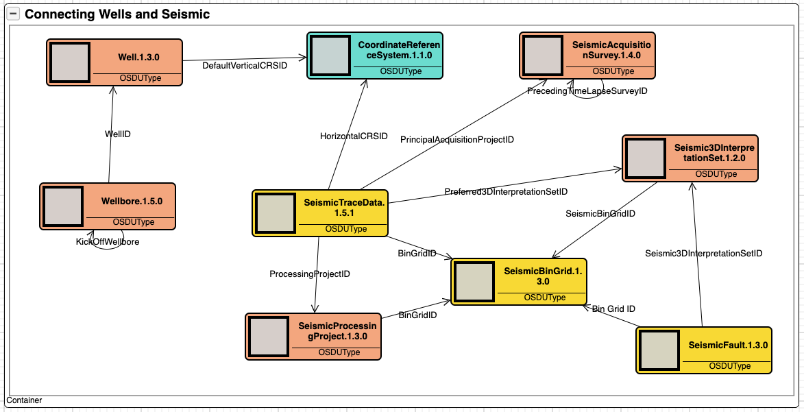 Figure 2 shows how independent domains such as wells and seismic can be related by use of geolocation (CRS). This is extremely useful when we want to know what wells exist in an area covered by a seismic survey.