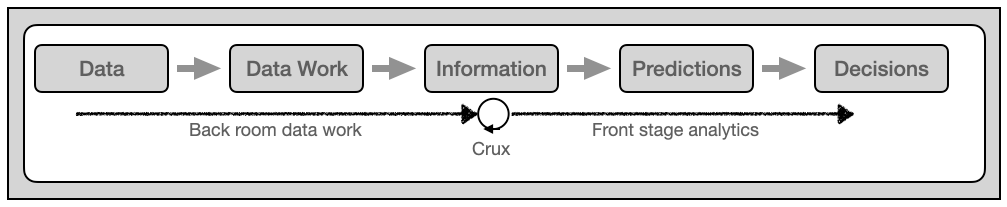 This means that the back room data work boils down to implementing the data stewardship that enables the best possible information given the data at hand. It’s directly connected to the prediction making that is based on the information we have, and the underpinning causal relationships that governs the physical world we are part of (liquids flow downwards due to gravity).